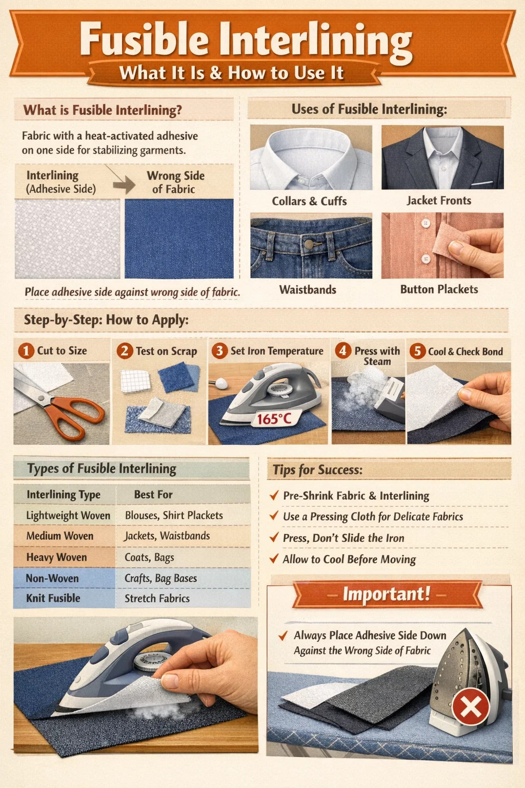 Att applicera smältbart mellanfoder korrekt första gången sparar både tyg och frustration. En misslyckad bindning - en som bubblar, skalar eller lämnar mellanlägget delvis lossnat - kommer vanligtvis från felaktig temperatur, otillräckligt tryck eller att järnet flyttas istället för att trycka på det. Följ denna sekvens varje gång.