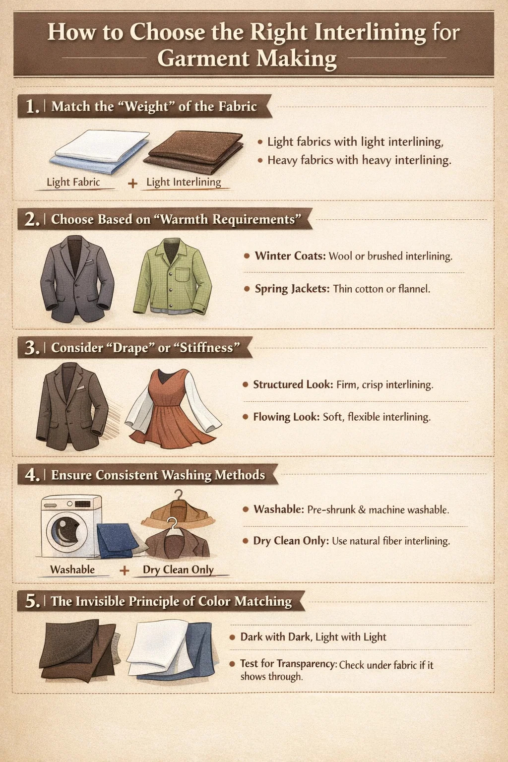 I plaggtillverkning, att välja rätt interlining är ett avgörande steg för att bestämma texturen och livslängden för det färdiga plagget. När du väljer interlining kan du hänvisa till följande enkla och praktiska principer:
