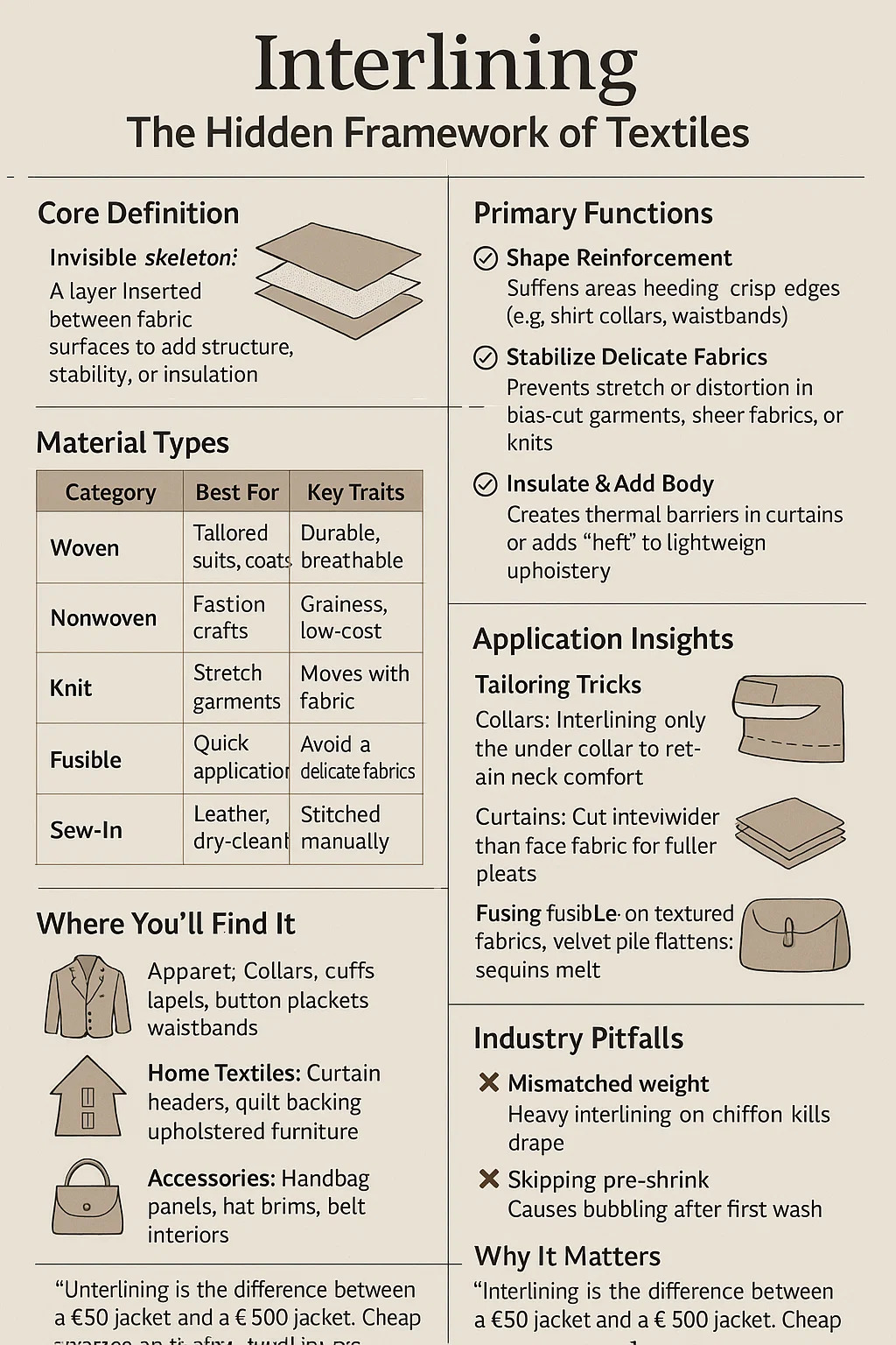 "Interlinje är skillnaden mellan en € 50 jacka och en € 500 jacka. Billiga versioner spricker efter kemtvätt; lyxtyper överlever det yttre tyget." - Skräddarsydd skräddare, Milan