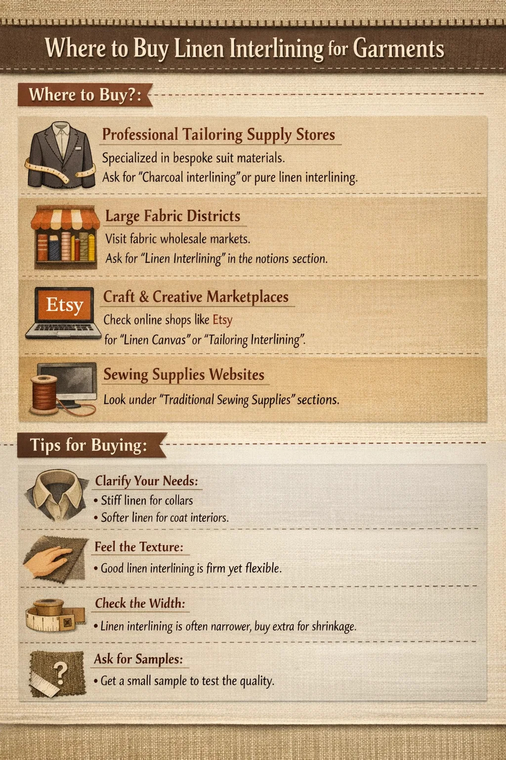 Om du funderar på att köpa linne interlining eller gränssnitt för plaggtillverkning, det finns flera pålitliga källor du kan utforska. Eftersom linne är ett relativt högklassigt material som används i skräddarsydda kostymer och högkvalitativa färdiga kläder, måste du leta i specialiserade tygaffärer.