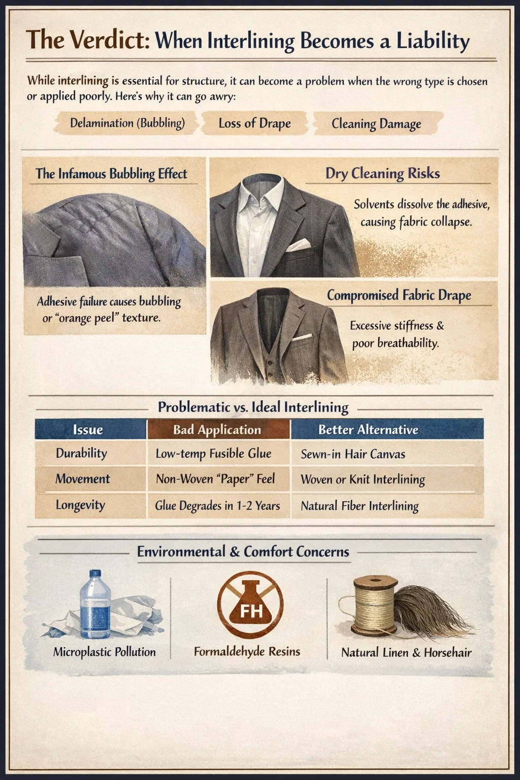 För att vara tydlig, interlining är inte dåligt i sig ; i själva verket är det väsentligt för strukturen. Det blir dock "dåligt" när fel typ väljs eller när den appliceras dåligt. De främsta anledningarna till att ett specifikt mellanfoder kan anses vara skadligt för ett plagg inkluderar delaminering (bubblande) , a förlust av naturligt drapering , och negativa reaktioner på rengöring . När bindningen mellan mellanfodret och ansiktstyget misslyckas, skapar det permanenta estetiska skador som inte kan vändas.